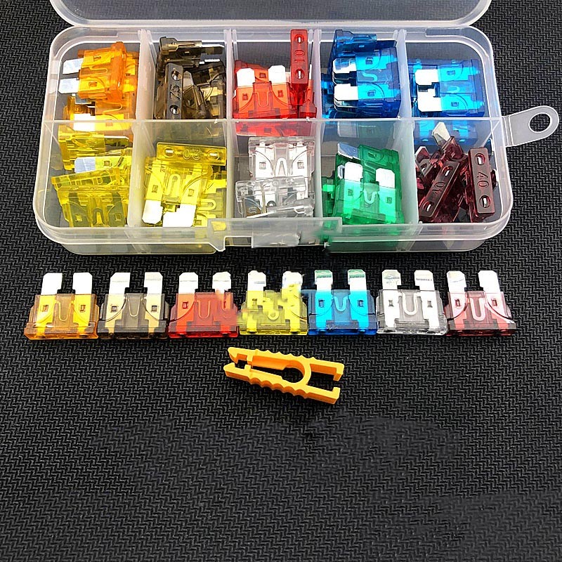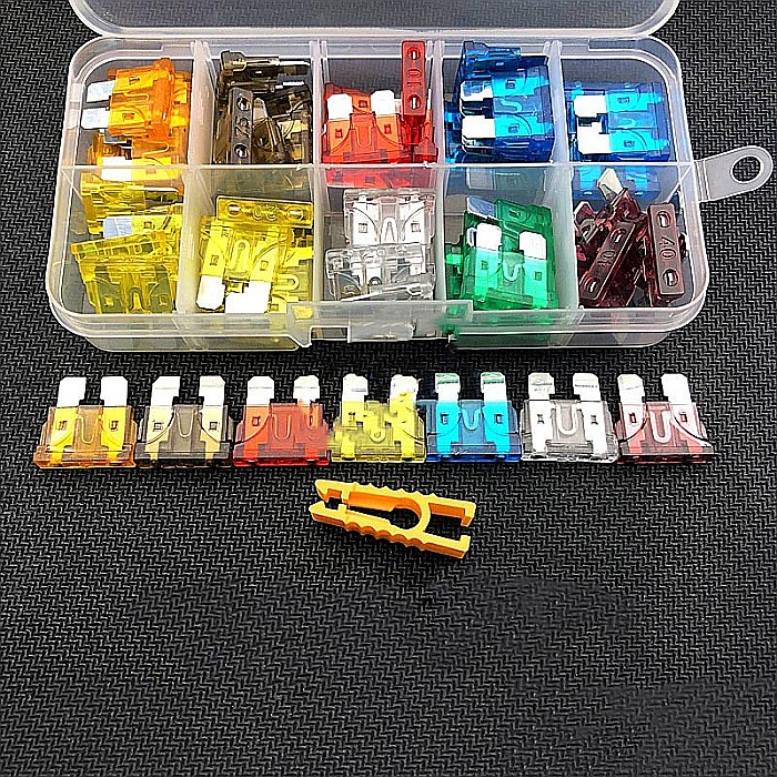 KIT 50 sigurante 5/7.5/10/15/20/30/40A diverse culori (5 verzi 30A, 5 rosii 10A, 5 portocalii 5A, 10 galbene 10A, 5 transparente 25A, 5 maro 7.5A, 10 albastre 15A, 5 mov 40A)