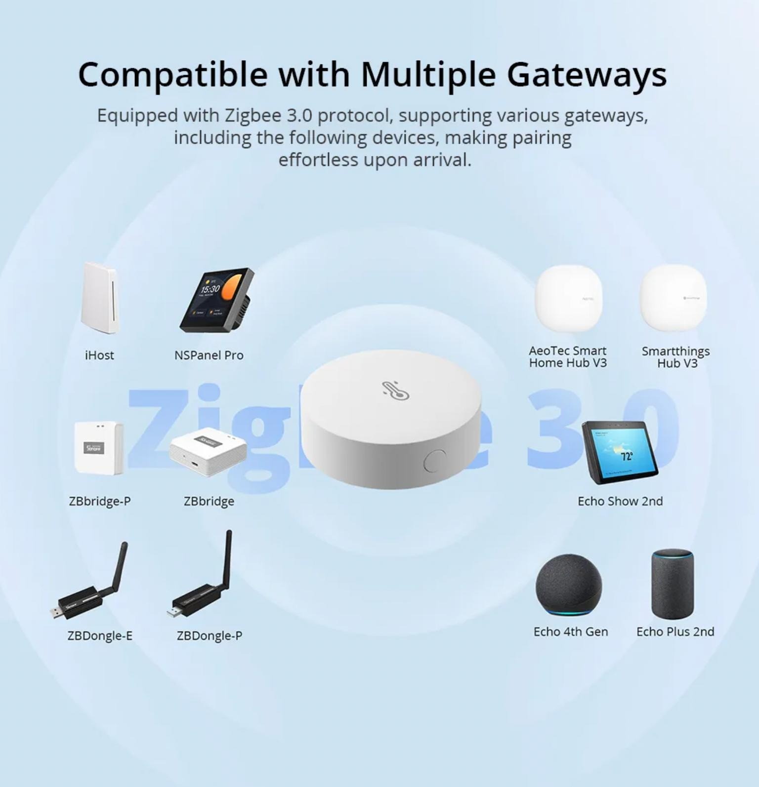 Compatibil ZigBee 3.0 - suporta hub-uri ZigBee utilizand porotocol ZigBee 3.0 (precum iHost, NSPanel Pro, ZB Bridge Pro, ZBDongle-E). Permite teoretic atasarea la hub-uri precum Echo 4th Gen, SmartThings Hub V3.