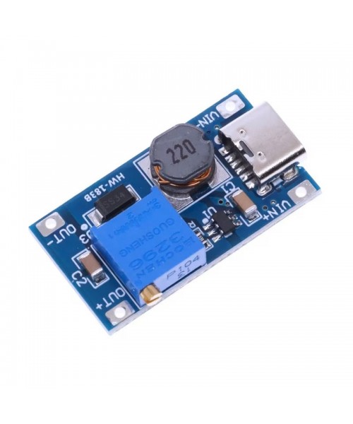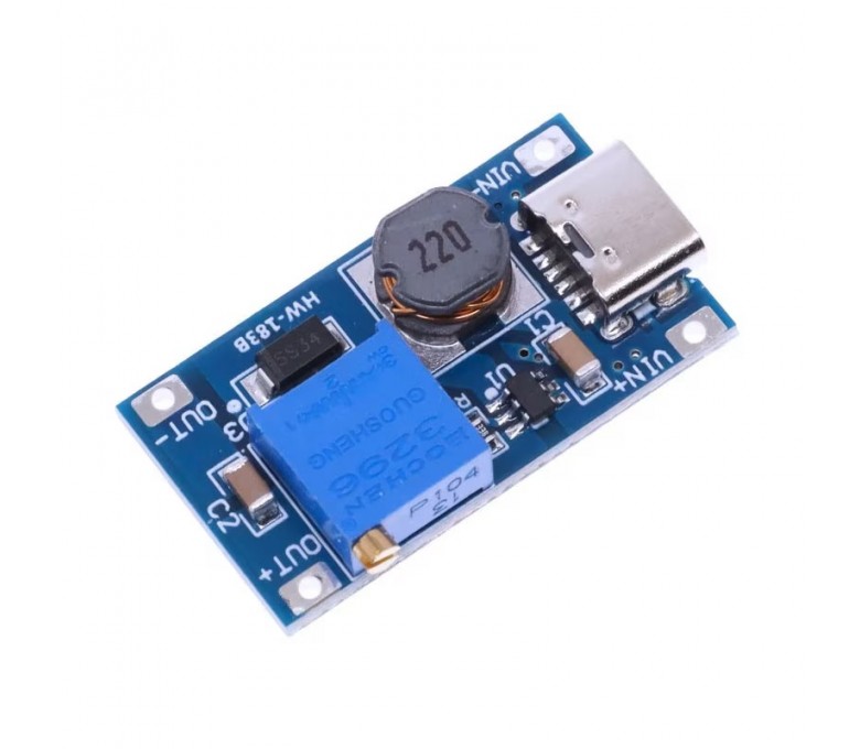 Modul convertor DC-DC step-up (boost) reglabil, cu intrare 2–24V si curent maxim 2A. Suporta alimentare Type-C, eficienta ridicata peste 93% si dimensiuni compacte.